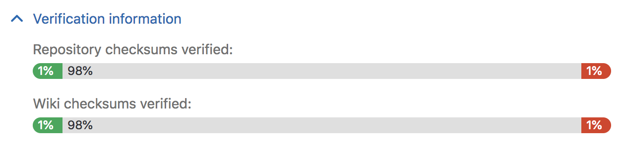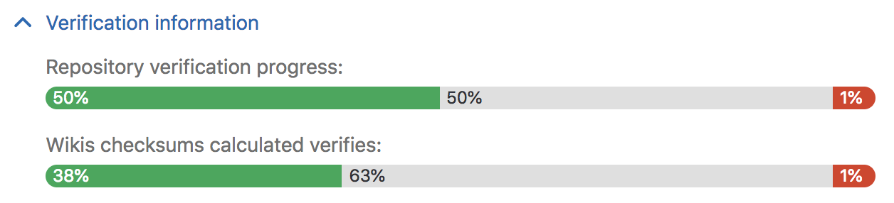 Visit the Admin Area ➔ Geo nodes dashboard on the secondary and expand the Verification information tab for that node to view automatic verifcation status for repositories and wikis. As with checksumming, successes are shown in green, pending work in grey, and failures in red.