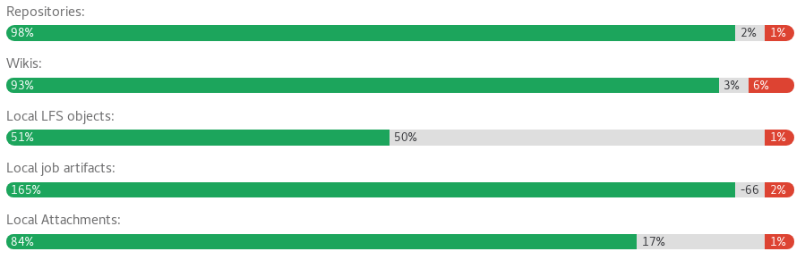 Visit the Admin Area ➔ Geo nodes dashboard on the secondary node to review status. Replicated objects (shown in green) should be close to 100%, and there should be no failures (shown in red). If a large proportion of objects aren't yet replicated (shown in grey), consider giving the node more time to complete