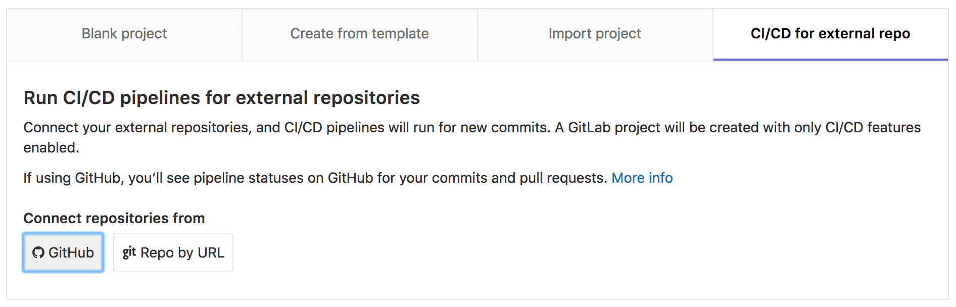 In GitLab create a CI/CD project using the Git URL option and the HTTPS URL for your GitHub repository. If your project if private, use the personal access token you just created for authentication.