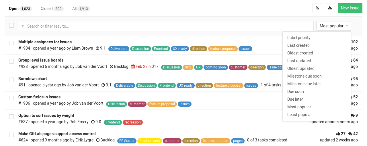 You can quickly sort issues and merge requests by the number of votes they have received. The sort options can be found in the dropdown menu as "Most popular" and "Least popular".