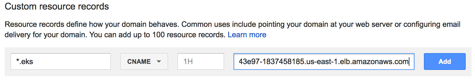 The Ingress is now available at this address, and will route incoming requests to the proper service based on the DNS name in the request. To support this, a wildcard DNS CNAME record should be created for the desired domain name. For example *.myekscluster.com would point to the Ingress hostname obtained earlier.