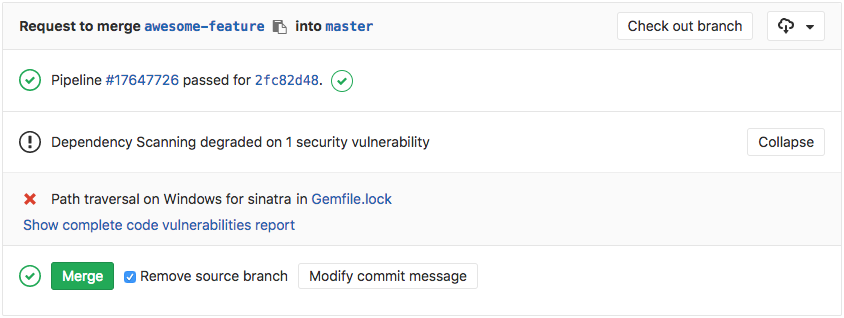 Going a step further, GitLab can show the vulnerability list right in the merge request widget area.