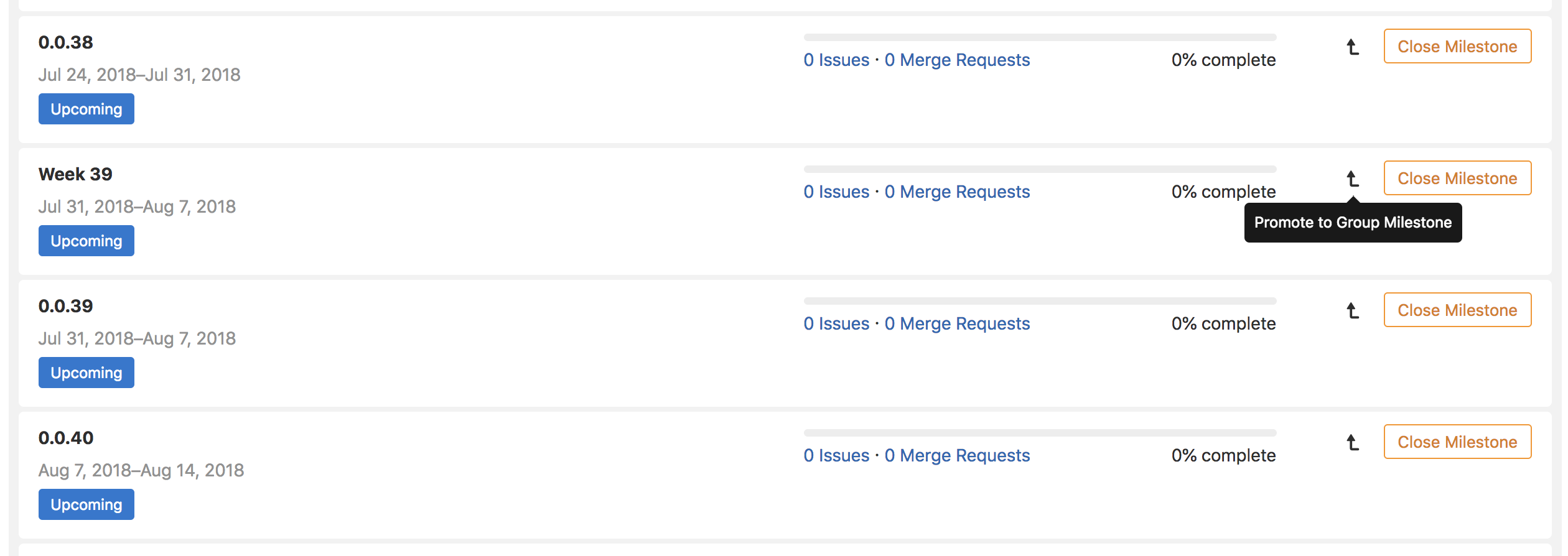 If you are expanding from a few projects to a larger number of projects within the same group, you may want to share the same milestone among multiple projects in the same group. If you previously created a project milestone and now want to make it available for other milestones, you can promote it to a group milestone.